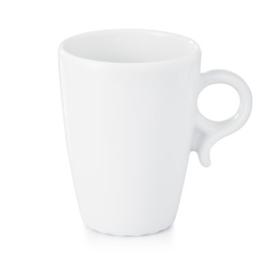 Zgrabny kubek reklamowy o niewielkich rozmiarach i charakterystycznym okrągłym uchwycie.