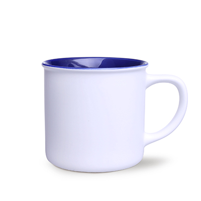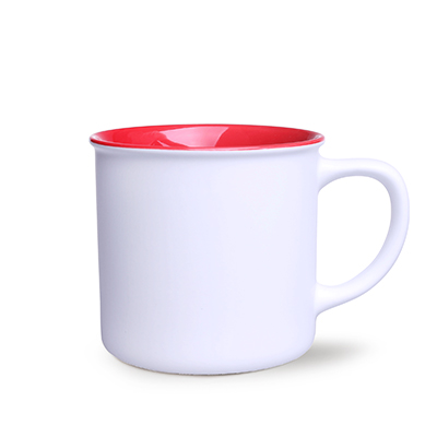 Mały z wyglądu, lecz o dużej pojemności kubek ceramiczny o białej, matowej powierzchni zewnątrz i kolorowym środku.